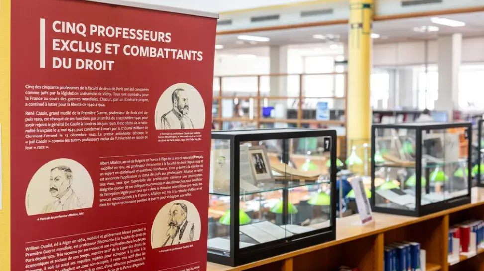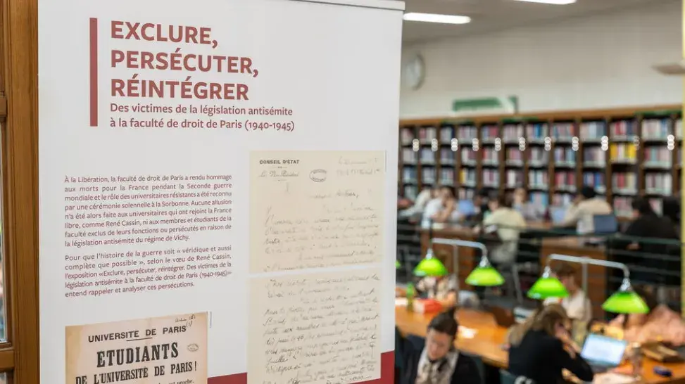 Lancées le 28 avril – au lendemain de la Journée du souvenir des victimes de la déportation – à l’issue de la cérémonie de pose de la plaque commémorative rendant hommage aux étudiants et personnels déportés et persécutés durant la Seconde Guerre mondiale dans le hall Saint-Jacques du centre Panthéon, les deux expositions Exclure, persécuter, réintégrer : Des victimes de la législation antisémite à la faculté de droit de Paris sont encore accessibles pour la première dans la salle de lecture de la bibliothèque Cujas jusqu’au 31 octobre 2025 et pour la seconde, pensée en parallèle, en ligne.